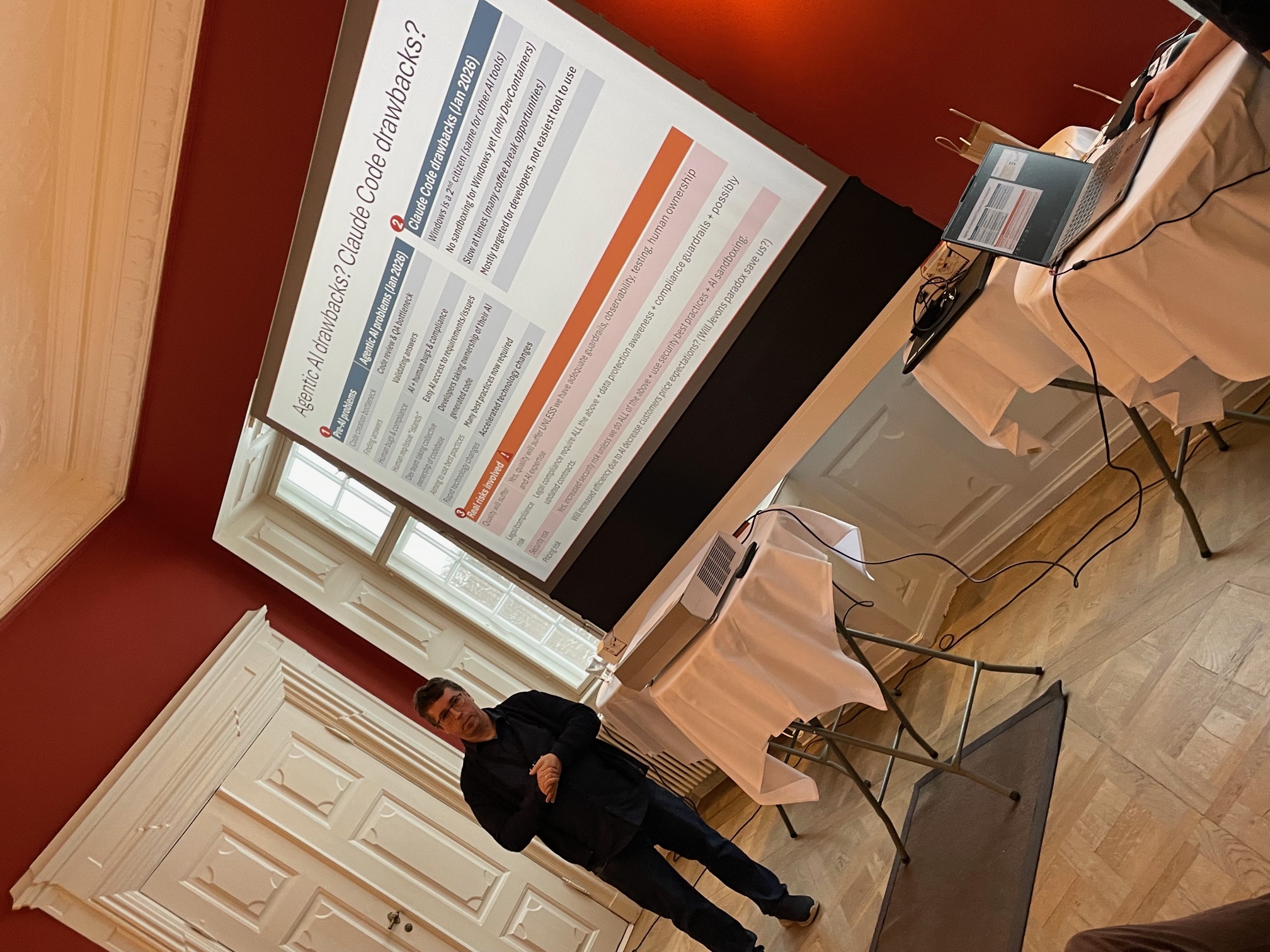Under ledelse af Morten M. Christensen, Director for Arkitektur, AI & Test, gik vi helt ned i det tekniske fundament. Vi arbejdede konkret med agentic AI og coding-agenter. Vi testede værktøjer hands-on. Vi drøftede produktivitetsgevinster – men også de klassiske dyder: kvalitet, sikkerhed og solid arkitektur.